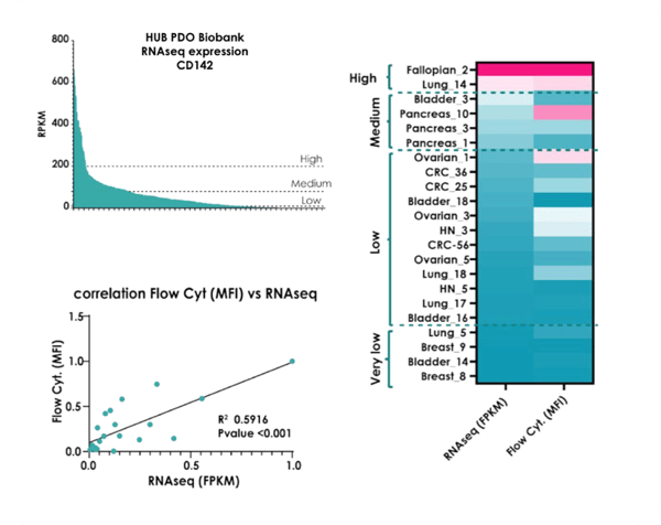 We first measured CD142 expression in all organoids, using both FACS analysis and RNA sequencing. The two data sets lined up beautifully - a reassuring sign that our expression data were solid. But when we compared those expression levels to how each organoid actually responded to Tivdak, the story changed completely.
